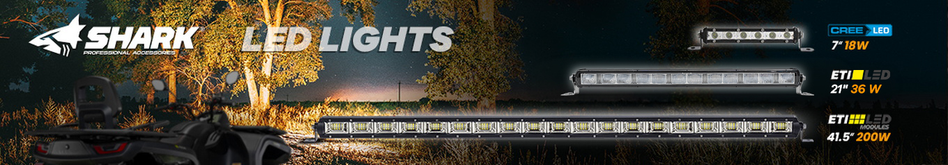 Vysokovýkonná profesionální pracovní a přídavná světla a světelné rampy SHARK pro čtyřkolky, terénní auta a pick-upy, přívěsy, lodě, nákladní automobily, bagry, nakladače a další pracovní techniku. Silná světla s účinnou LED technologií a moduly CREE nebo EPISTAR s nízkou spotřebou proudu mají dosvit až 950 metrů. LED světla SHARK svítí i pod vodou a jejich životnost dosahuje desítek tisíc hodin. Možnost vrchní, spodní nebo boční montáže.