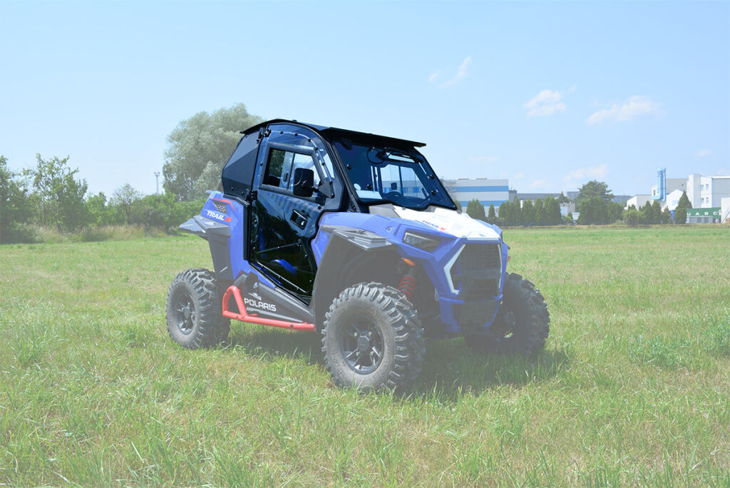 Vyhřívaná kabina pro Polaris RZR TRAIL S, čiré polykarbonátové dveře, uzamykatelné, o 180° otevíratelné, s posuvnými okny, přední okno z bezpečnostního skla se stěračem a ostřikovačem, zadní čelo z čirého tvrzeného UV-odolného polykarbonátu, teplovodní topení